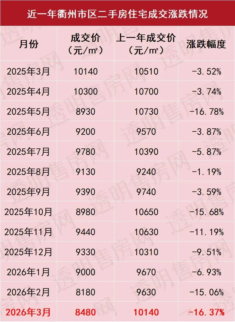 从成交价格来看,2026年3月衢州市区二手房住宅成交均价为8480元/㎡,同比去年下跌16.37%。