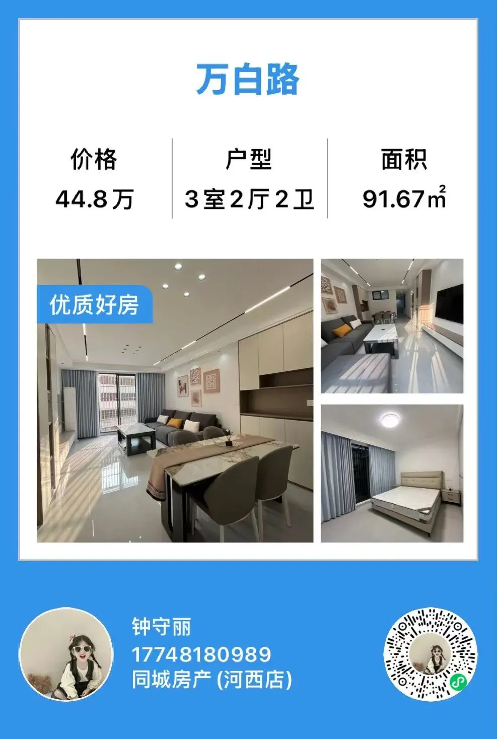 【万源房产】万白路,91平方,3室2厅2卫,精装,家具家电齐全,总价44.8万