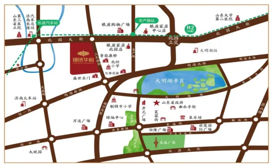 项目位于市区绝版核心区域(大明湖西北),位置极其优越(原济南市国棉三厂),东临三孔桥街,南侧为仁丰前街,北侧为北园大街;直线距离大明湖约1.5公里,距离山东省政府约2.2公里,距离济南火车站约1.5公里;临近大明湖站、济南火车站及济南长途汽车总站、北园高架及地铁2号线,道路通达性强,畅达全城;紧邻北园商圈、泉城广场商圈、万达商圈,三大商圈,配套成熟。