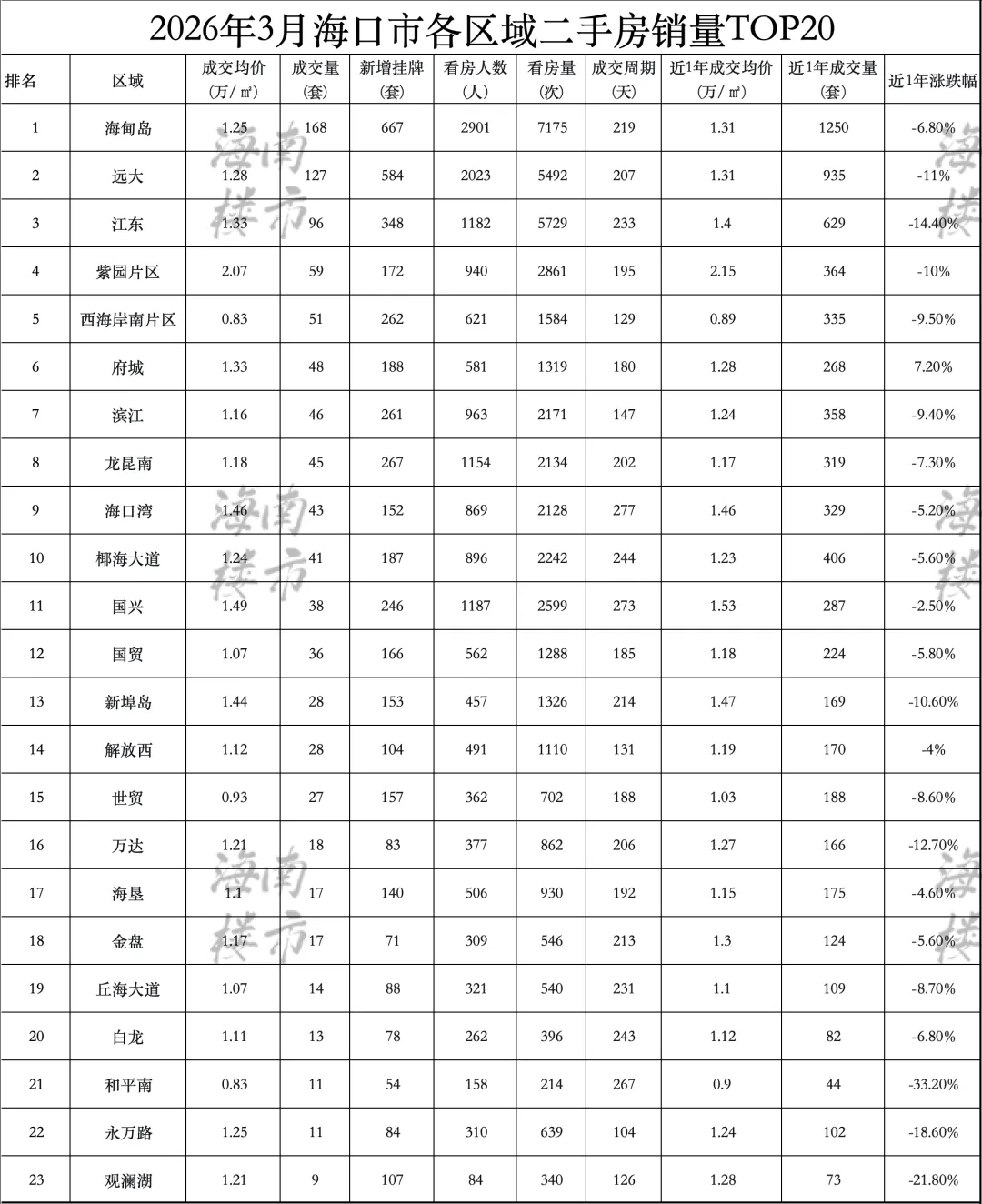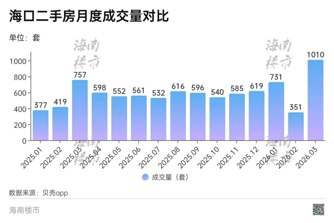 3月,海口二手房市场交出了近15个月来最好看的成绩单——成交首次突破1000套,看房人数创下新高。但繁荣背后,区域冷热分化同样清晰:有的区域104天就能出手,有的区域挂出去277天还在等买家!2026年3月,海口二手房成交量达到 1010套,统计周期内首次突破千套大关。
