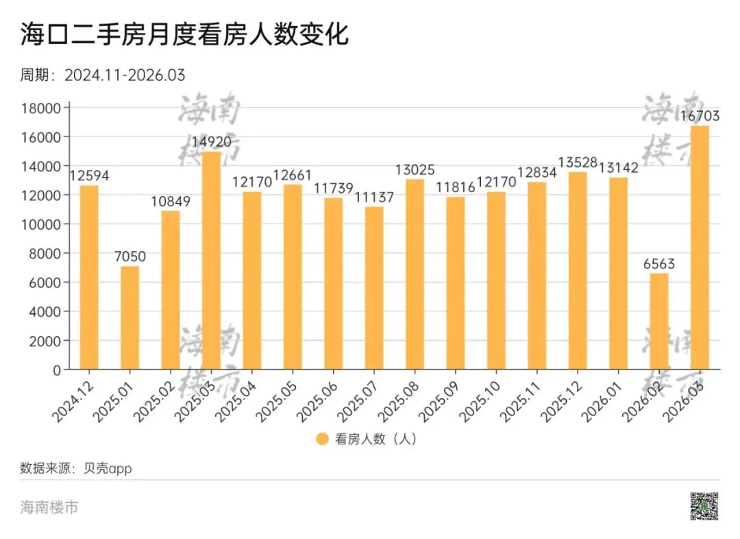 3月看房人数16703人,是2月(6563人)的2.5倍,同时超越了2025年3月的14920人峰值,创下近一年半新高。