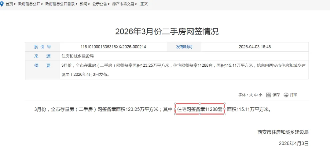 近日,3月份西安二手房网签数据发布。今年3月西安二手房网签备案面积123.25万㎡;其中,住宅网签备案11288套,面积115.11万㎡。