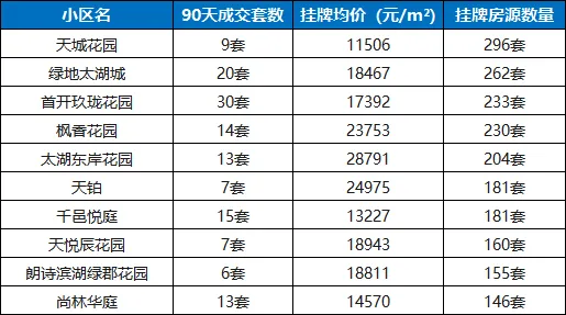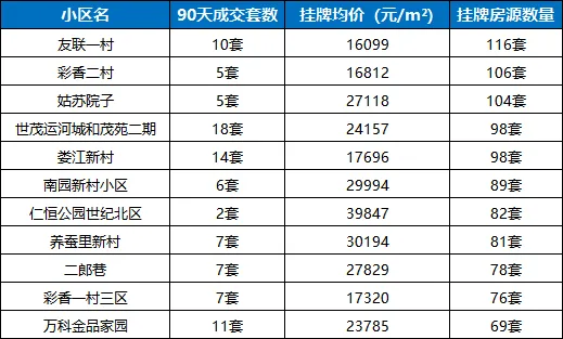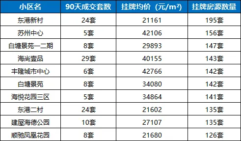 今天,我们整理了各区域挂牌量前10的小区,发现不少小区的挂牌量明显比之前要少。从统计的数据中可以看到,东港新村、苏州中心、白塘壹号、海尚壹品等挂牌量都在140套以上,较之前已有大幅减少!东港新村,这个小区本身体量比较大,挂牌量也一直处于高位,小区成交情况也不错,近3个月成交了24套。姑苏区挂牌量最多的小区是友联一村、彩香二村、姑苏院子、世茂运河城、娄江新城等。姑苏老旧小区关注度很高,拆迁、搬迁、改造等城市更新的动作一直不断。老新村齐出货,多个小区挂牌量减少!高新区挂牌量较多的小区是鸿文雅苑、理想家园、南山楠香雅苑、狮山新苑、万科遇见山等。鸿文雅苑挂牌量高,小区关注度也非常高,成交量也很不错。吴中区挂牌量最多的小区集中在郭巷、太湖度假区、城南、木渎等板块。郭巷的独墅西岸花园、太湖度假区的蔚蓝四季、华丽家族太上湖汇景花园,城南的石湖华城等等,目前挂牌量都在120套以上。与去年相比挂牌量也是大幅减少了。相城区金双湖花园、环秀湖花园、魅力花园、中海珑湾锦园、金辉融侨城等挂牌量也比较大。阳澄湖的金双湖花园挂牌量最高,魅力花园挂牌量多,成交量也大,90天成交了28套。相比苏州各大区域,吴江区的出货量明显高,天城花园、绿地太湖城的挂牌量超出了260套,首开玖珑花园、枫香花园、太湖东岸花园、天铂、千邑悦庭的挂牌量也很高,都在180套以上。不过多个小区成交也是相当火热,链家网显示,首开玖珑花园90天成交了30套,绿地太湖城90天成交了20套。