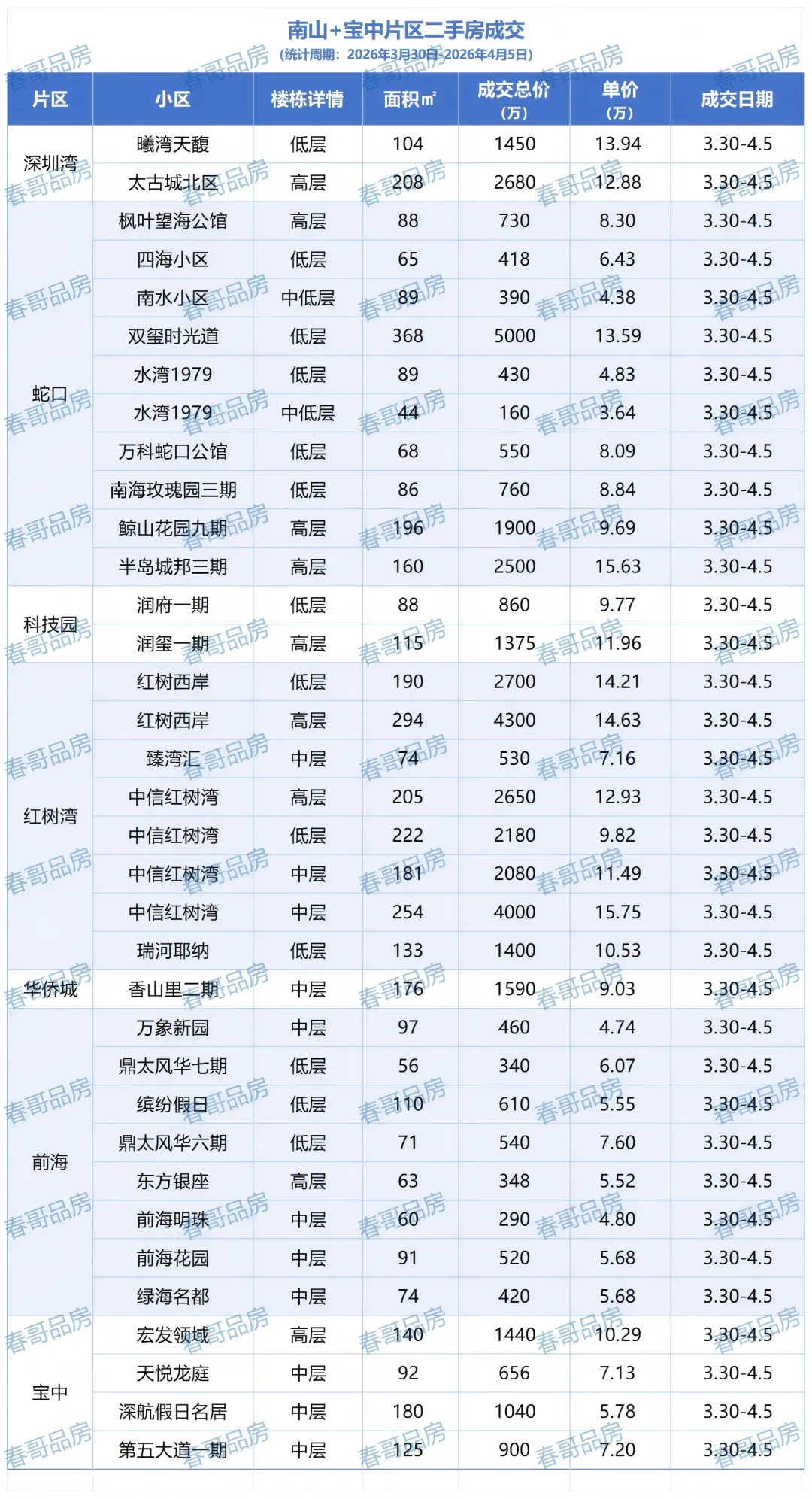 春哥品房目前主营:深圳湾、蛇口、华润城、红树湾、华侨城、香蜜湖、前海、宝中区域二手房及全市新房交易,每周将为大家整理深圳核心片区二手房成交数据,大家买房时可以用来做参考和借鉴。如果觉得有用,欢迎持续关注“春哥品房”公众号。