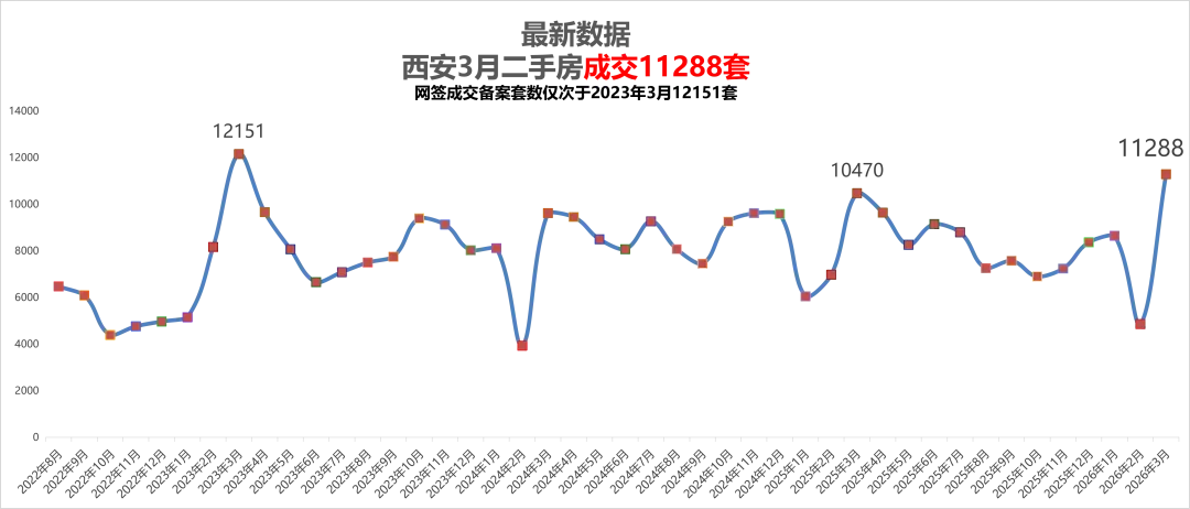 最近一周,“西安二手房”持续霸占话题TOP3,网传3月网签1.4万套的消息刷屏后,官方数据11288套正式出炉,仅次于2023年3月,直接创下2022年8月至今的第二高战绩。