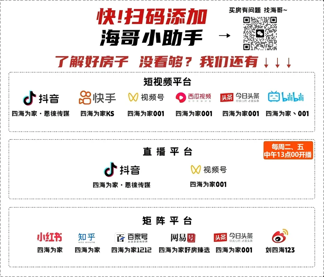 另外,今天我们(视频号:四海为家001)的直播中,针对刚需、改善、学区房等不同需求,也给出了专属选房方案。