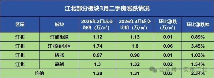 这其中,江北核心区整体涨幅最高,板块2月成交均价为1.74万/㎡,3月成交均价为1.8万/㎡,房价上涨了600元/㎡,涨幅达3.45%,位居江北第一。