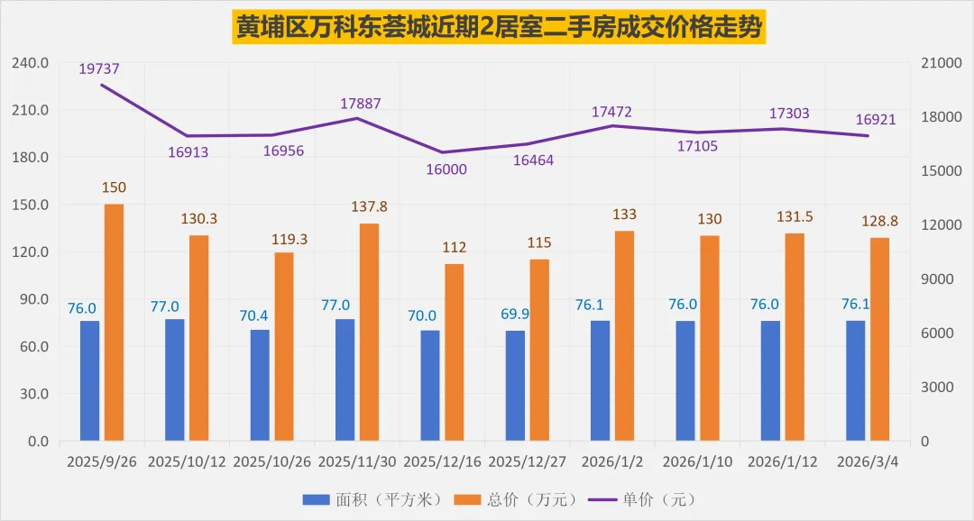 万科东荟城近期成交的10套2居室二手房,平均面积74.5平米,平均总价128.8万元,平均单价17295元/平米。