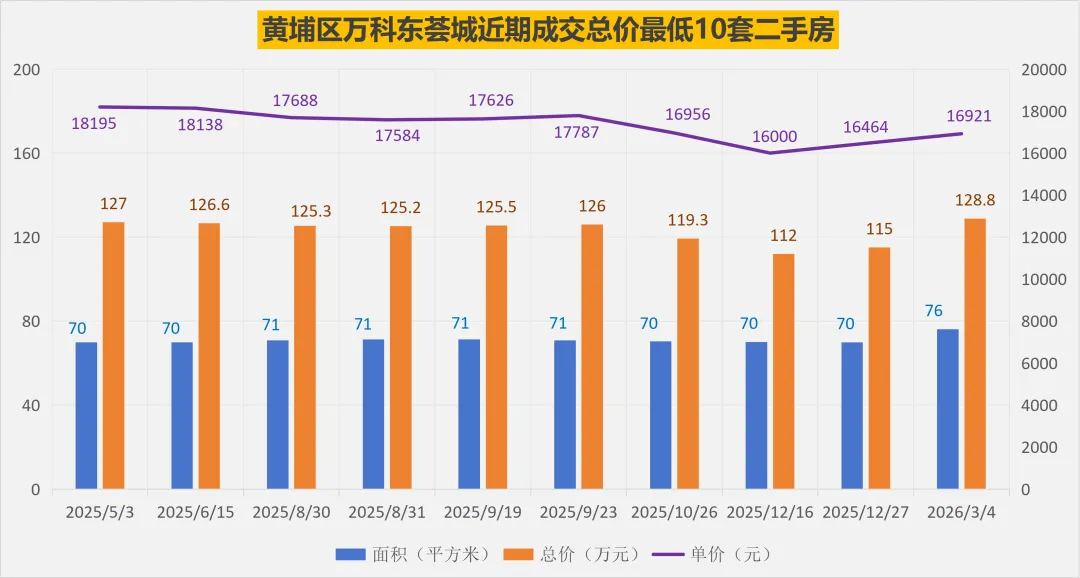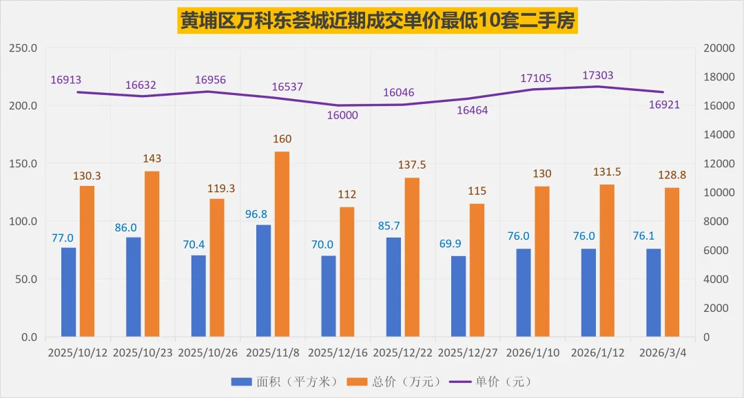 万科东荟城近期成交单价比较低的10套二手房,平均面积78.4平米,平均总价130.7万元,平均单价16680元/平米。