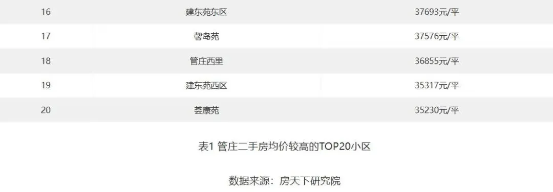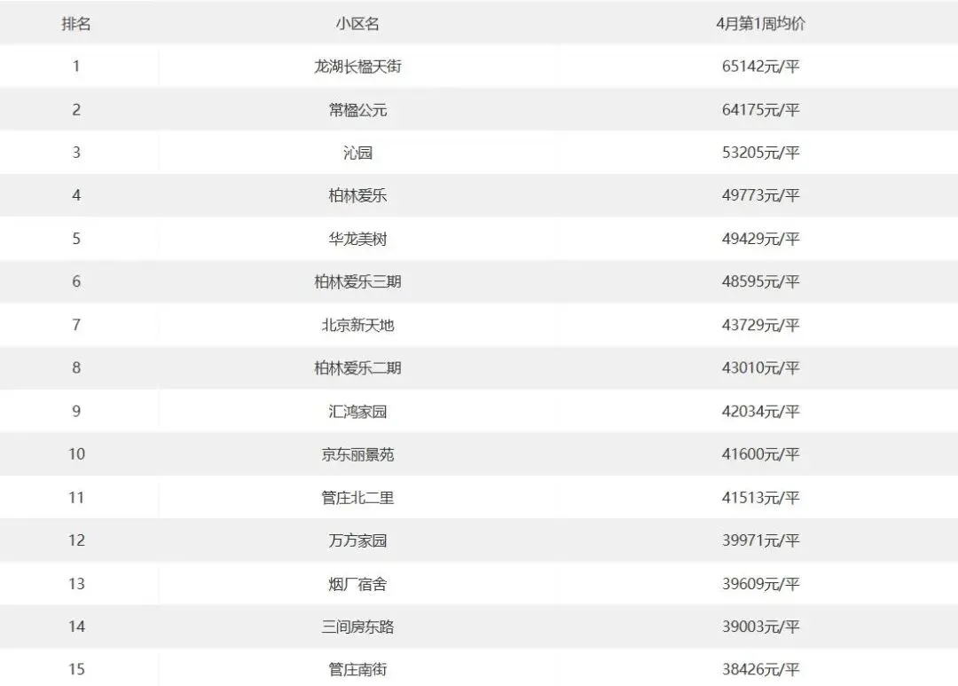 二、4月第1周管庄二手房住宅小区均价排行榜