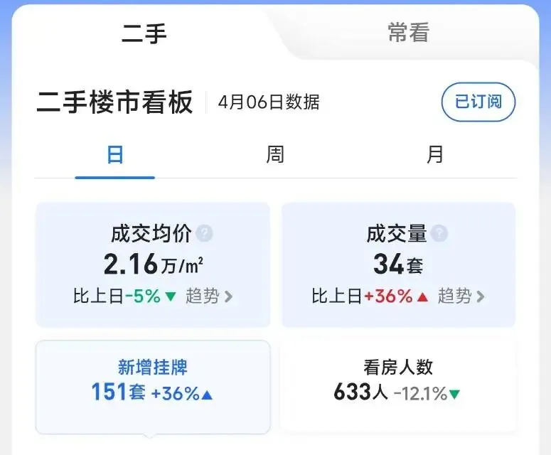 4月6日呈现典型“量涨价跌”行情,低价笋盘集中成交拉低整体均价,成交量小幅反弹;新增挂牌量同步上涨,业主挂牌积极性提升,但带看人数回落,买卖双方仍处博弈状态,买方议价空间扩大,市场信心尚未完全修复。