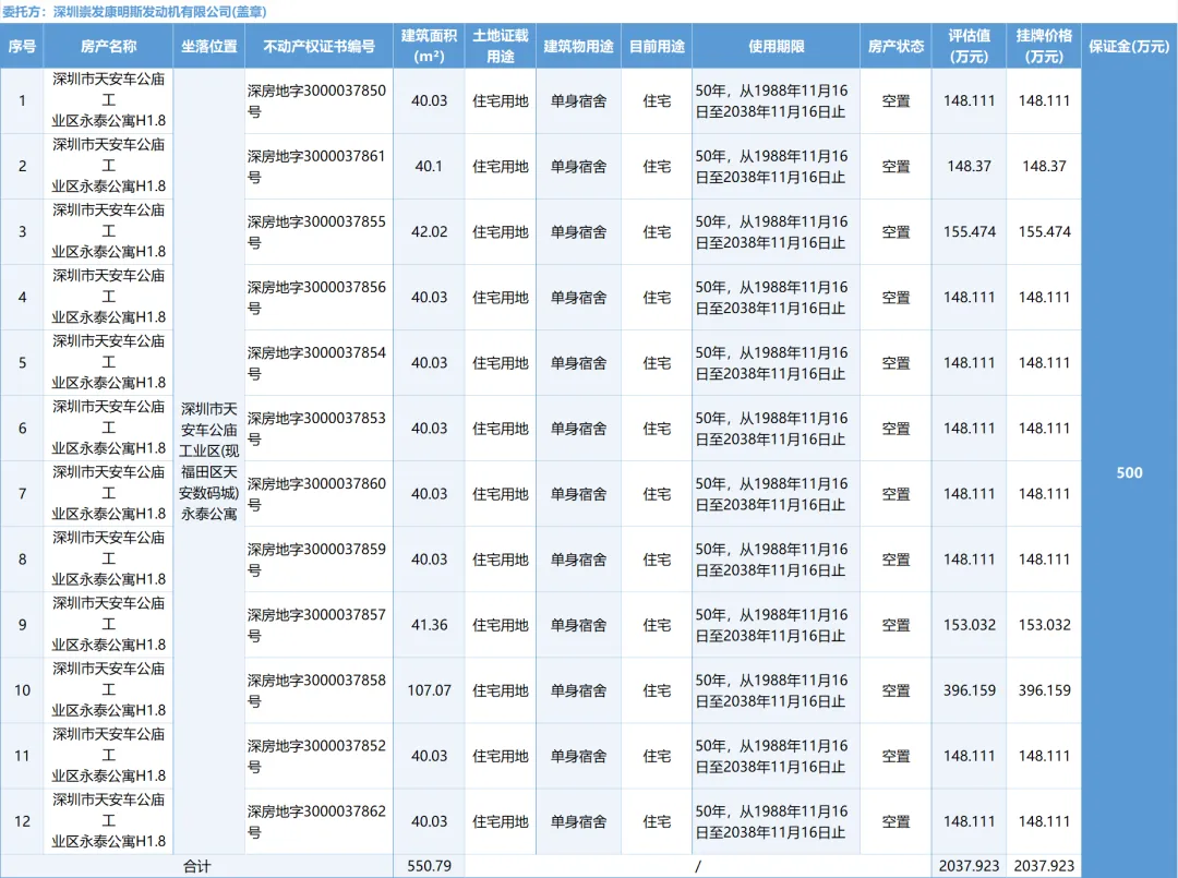 深圳市福田区天安数码城天展大厦、永泰公寓12套房产转让