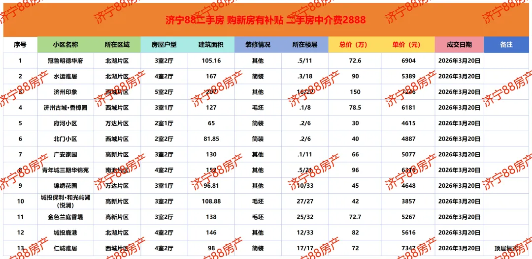 济宁二手房成交市场价参考|3月20日