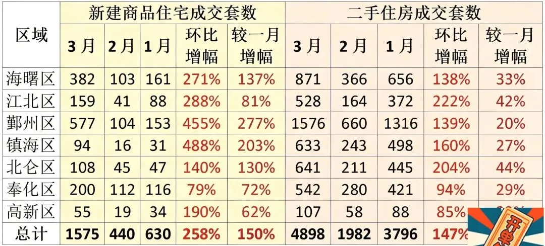 • 3月宁波新房、二手房成交双双暴涨,环比涨幅最高超500%,市场回暖已经是板上钉钉的事实;