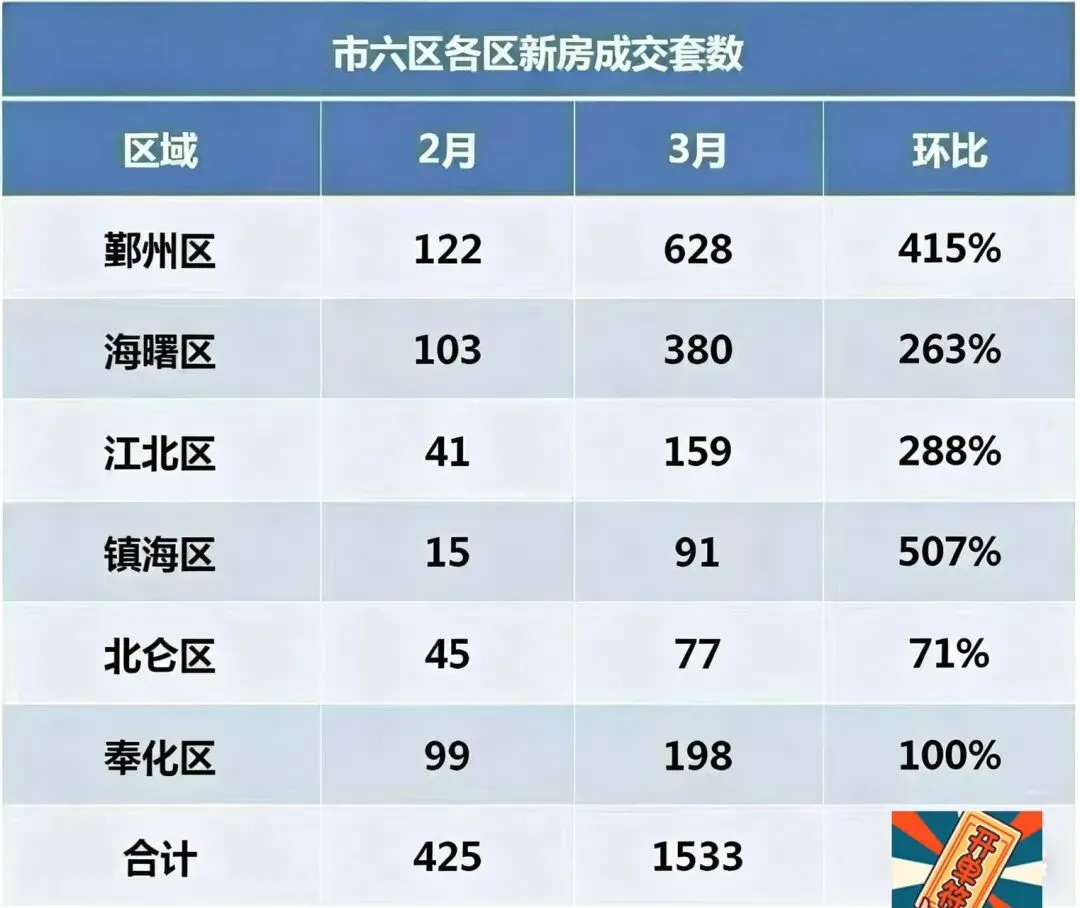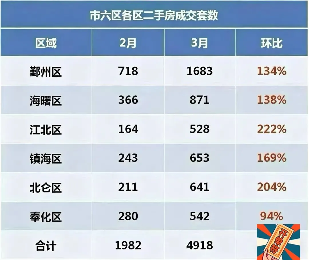 最近宁波2-3月的成交数据新鲜出炉,看完直接让人热血沸腾——新房、二手房成交双双暴涨,全市六区全面飘红,环比涨幅最高直接干到500%+,之前唱衰楼市的声音,这下彻底被数据打脸了!