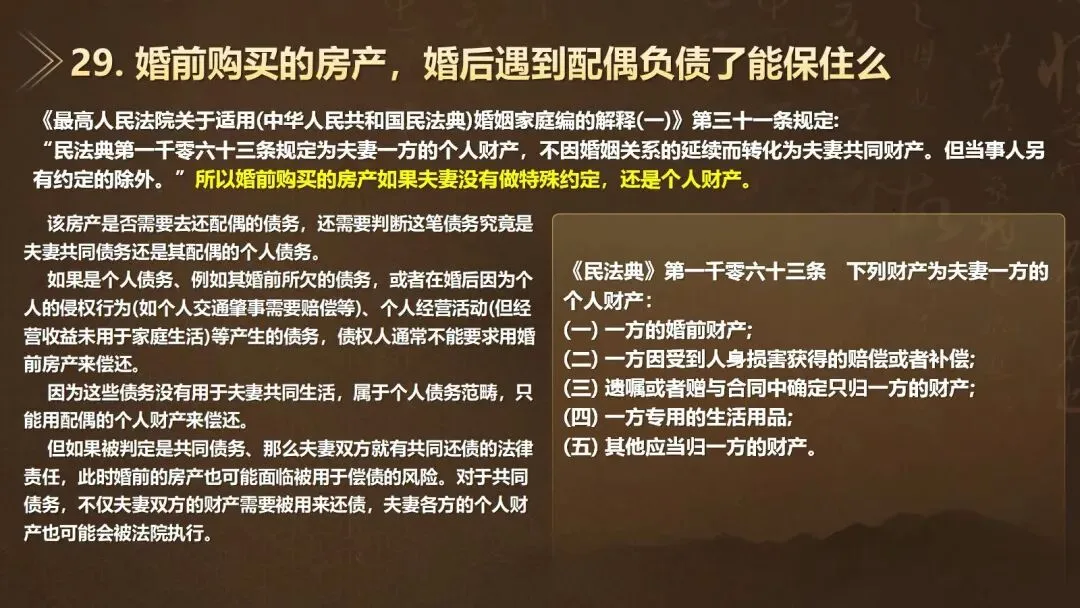 🌈Q29:婚前购买的房产,婚后遇到配偶负债了能保住么婚前购买的房产如果夫妻没有做特殊约定,是个人财产。该房产是否需要去还配偶的债务,还需要判断这笔债务究竟是夫妻共同债务还是其配偶的个人债务。1⃣️是配偶个人债务:婚前房产可以保全2⃣️夫妻共同债务:可能会被执行☝️具体详情请看上图Q30预告:如何尽量规避产生夫妻共同债务或认定夫妻共同财产