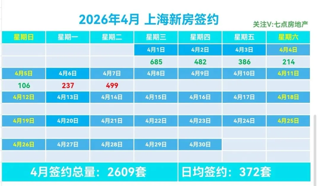 🏠4月上海新房总签约2609套,日均签约372套,本月签约总面积20.89万m²,套均面积77.19m²。