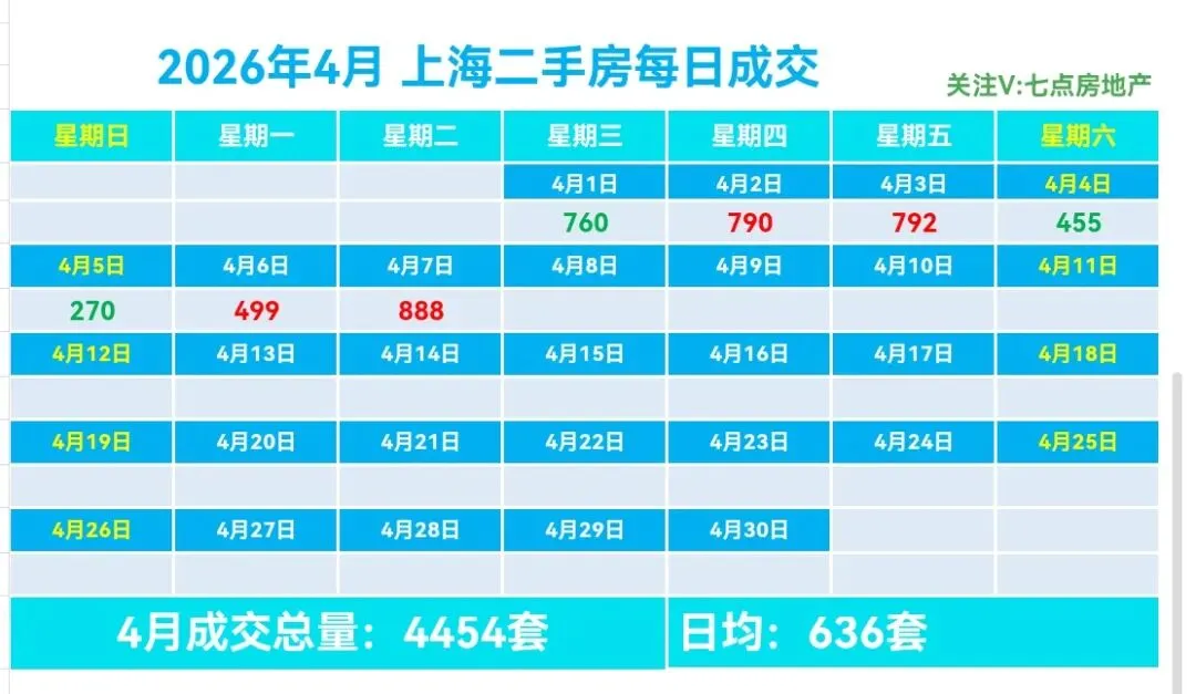 🏡4月,上海二手房成交量累计4454套,日均成交636套,较上个月日均减少370套(降幅36.78%)。