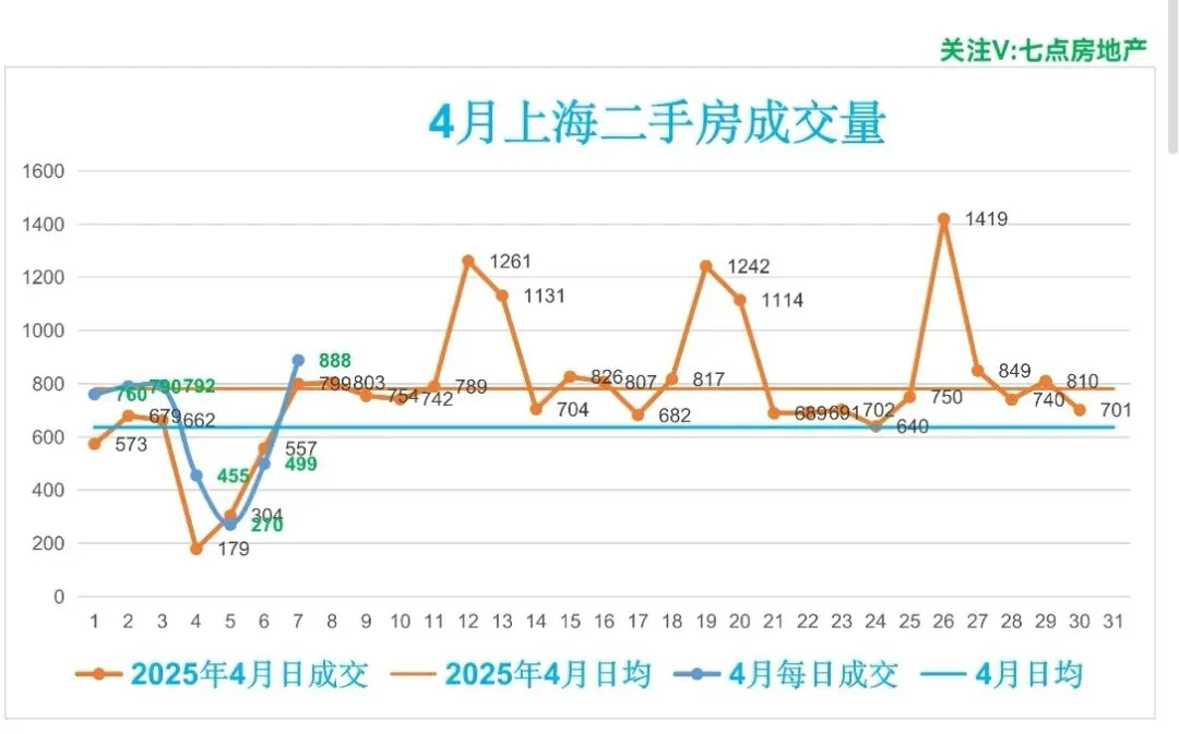 🏡昨日(4月7日,周二),上海二手房成交888套,较前一日增加389套(增幅77.96%),成交面积70847.36m²,套均面积79.78m²。