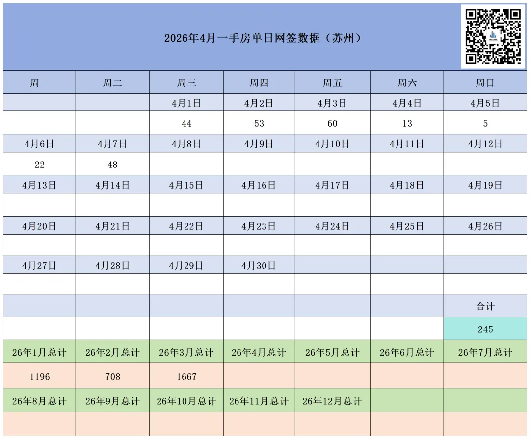 本月截至4月7日(周二),苏州六区住宅累计网签【1305套】,其中二手房累计网签【1060套】、新房累计网签【245套】。