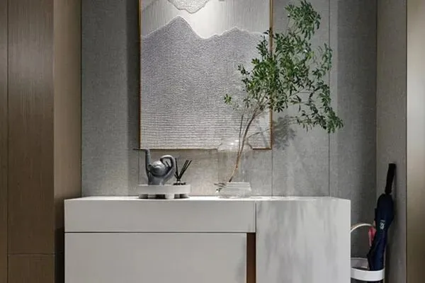 从成都青羊区的CBD处,一路驾车,在欣赏着成都市里独特的风景之后,约15分钟,到达了Hazel的新家了。我们送上了鲜花,就此开启了探访。第一站,家的第一联络员,玄关,在我们进入这个家的时候,就被这一处独具一格的玄关所吸引了。设计师Bea在这个方寸之间里,以灰色与白色作为了主色调,一个精巧实用的白色橱柜,上方是一幅精致的灰色现代画,橱柜上,一盆清新的绿植,和馥郁芳香的香薰,将这一处空间,营造出了自然的妙趣。然而,这一幅画上,是精美澹雅的山水,与这浓浓的香味,构建出一种悠远自在的意境来。在橱柜的一旁,是放置雨伞的小巧空间。不要小瞧了这一处玄关,它是这个家里稳重的仪式感之处。每天晨起,一家人,就从这雅致的玄关里,奔赴了活力满满的一天了。玄关,它是家第一序章了。