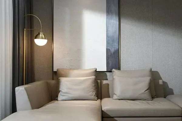 稍走了几步,来到了家的客厅空间。这间客厅的面积不小,堪称富裕了。设计师Bea在将客厅空间整合之后,空间变得规整有序。在一张长180cm,宽50cm,高60cm的转角皮革沙发的塑造之下,整个客厅绕显出了现代简约的利落与硬朗感。值得一提的是,这张沙发是近年来叫好又叫座的单品,天然韧劲的皮革,与高级的软包技术,配合上柔软的填充,让这张沙发舒适感极佳。而墙面上,一幅黄铜边框的现代灰色绘画,与一盏黄铜落地灯,在材质上进行了精巧的呼应,设计师Bea试图在材质,色彩上,眺望精致与轻奢。真是无黄铜,非轻奢了。这间简致的客厅里,流露出了浓厚的现代设计美学的秩序感,留下了精致生活的痕迹,进行了精巧的生活叙事了,无需赘言,客厅是家的第一中心了,让人不禁纷至沓来了。