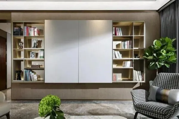 在客厅里,继续探索着,一面独具匠心的收纳墙,成为了吸睛的焦点。设计师Bea在这面墙的设计上,可以说,是费劲了匠艺了。这是一面可以推拉的墙面,打开面板,则是一个摆放着书籍的书架,推上面板,则是一个影视的投影屏幕。这一面墙,实用美观,大大满足了一家人收藏书籍的爱好,同时,也铸就了家的一道独特的风景线。墙面一侧的绿植,把空间装点的更具盎然生机,仿佛返璞自然之中,也让人在看书之余,倍感舒心了。这一面墙,它在客厅里,俨然是妙笔生花,悄然宣告了这个家的浓浓的人文底蕴,也续写了家客厅里的典雅气韵了。