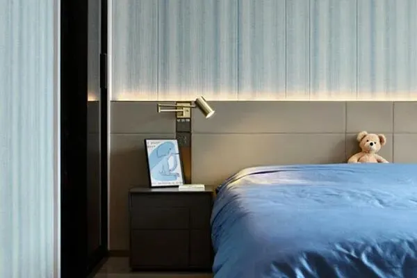 移步到了主卧室。这间主卧室空间面积适宜,如设计师Bea说:“卧室,无需过大,过宽,过高,它只需像母亲的子宫般安全。”依旧是灰色调,一张舒展的大床,温润如玉的床头墙,简练素雅的橱柜,与简洁利落的床头柜,在一盏温雅的台灯的照耀下,这间卧室,弥散出了柔韵绵长的气息来。当清风轻轻拂过,水波兴起,空间里的一切,似乎都刚柔并济,兼收并蓄了,让人暂别了城市的喧闹,宛若来到了城市的上空,俯瞰城市。在优雅从容之间,尽享宁静安祥了。这间卧室,在设计师Bea眼中,它拒绝了平庸,它不落窠臼,也标记了家的舒适度,饱含了家的温雅质感。