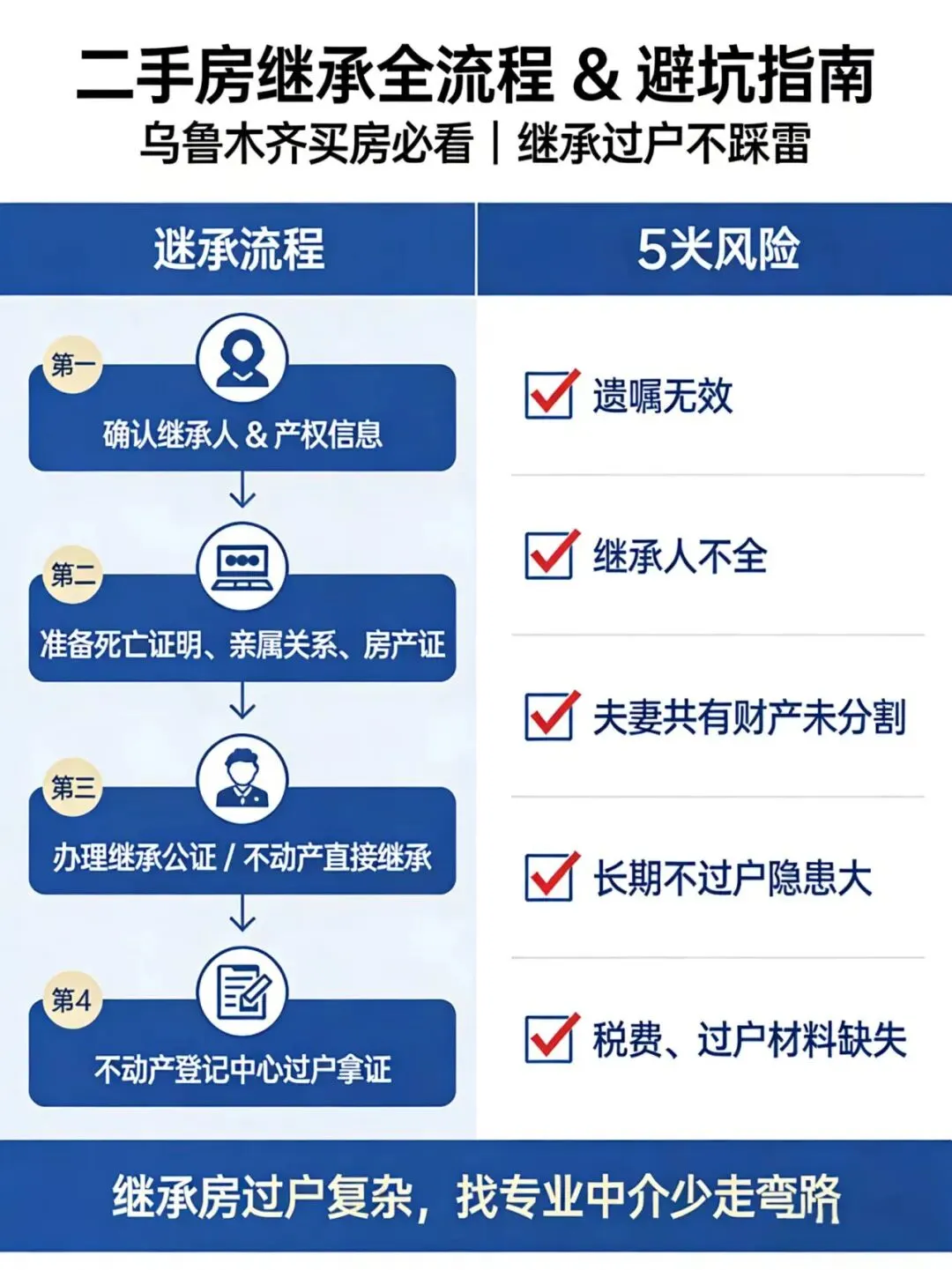 房产继承是房产交易中特殊且关键的一环,尤其对二手房从业者而言,掌握继承流程与风险要点,既能服务客户高效过户,也能帮客户规避潜在纠纷。本文结合乌鲁木齐本地政策,从实操流程到风险提示,一次性讲清二手房继承那些事