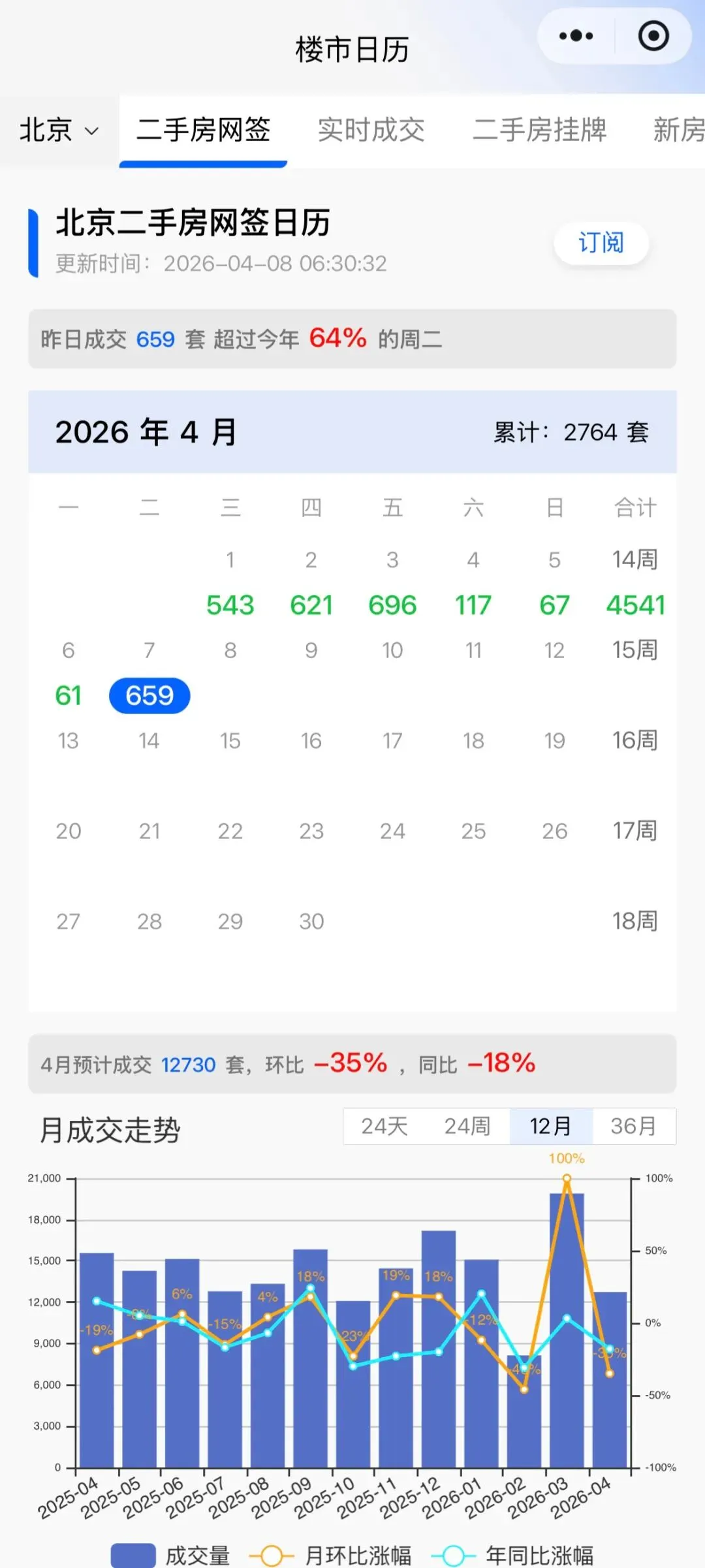 从最新的网签数据来看,4月7日北京二手房成交659套,虽然超过了今年64%的周二,但整体热度较3月有明显回落。4月预计成交1.27万套,环比下降35%,同比下降18%。