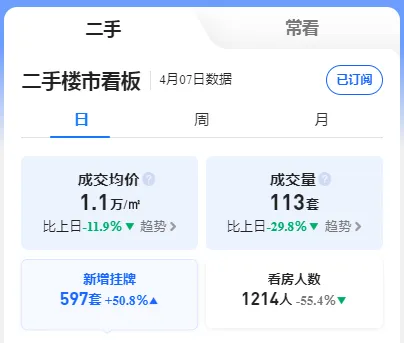 根据4月7日二手楼市数据,市场呈现明显的降温态势:成交均价为1.1万元/㎡,较前一日下跌11.9%;成交量仅113套,环比减少29.8%;看房人数骤降55.4%至1214人。与此同时,新增挂牌量达597套,环比大增50.8%,形成供需失衡格局。