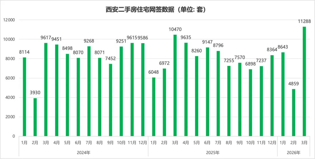 据西安市住建局数据,3月二手住宅网签11288套,环比暴涨132%,创近三年新高。