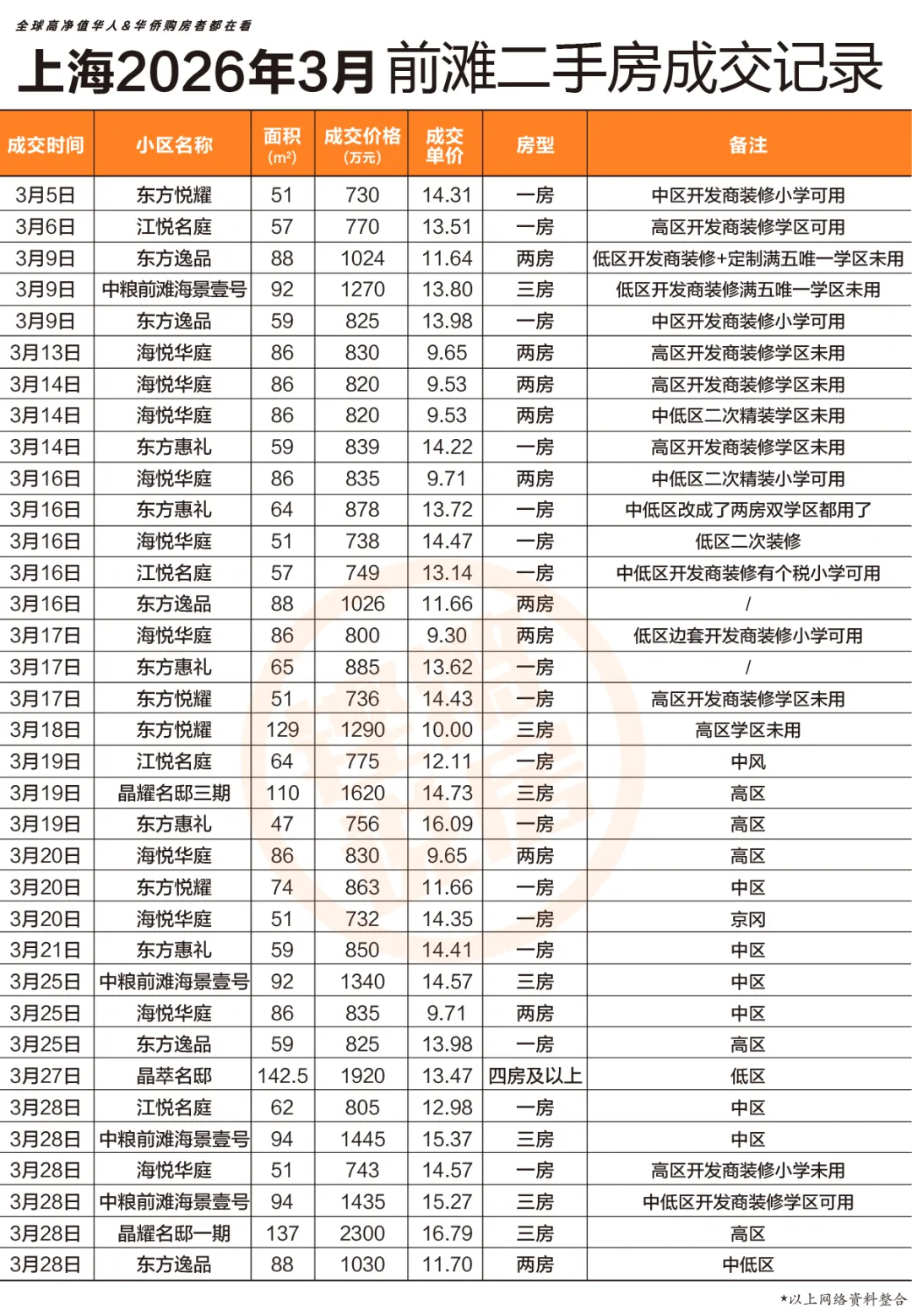 前滩3月二手房成交,不完全统计35套,总成交标的近3.5亿,均价12.9万/㎡。