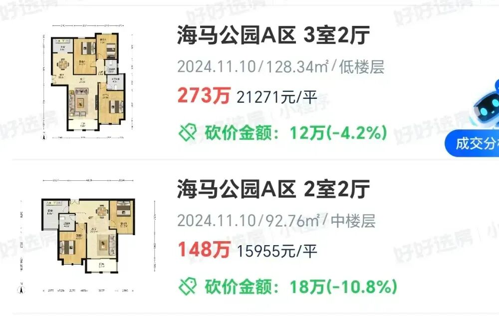 2024年11月份海马公园A区128平的大三房成交价21000元/m²出头,92平的大两房成交价16000元/m²左右,大户型单价比小户型单价高大约5300元/m²。