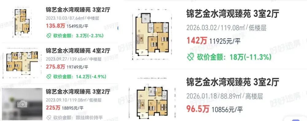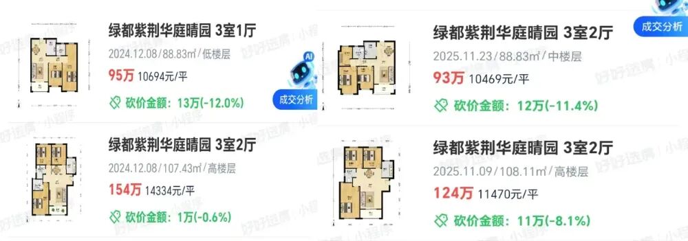 还有管南的绿都紫荆华庭晴园107平大三房和88平小三房的价差,从2024年的3600元/m²降到了去年11月的1000元/m²。