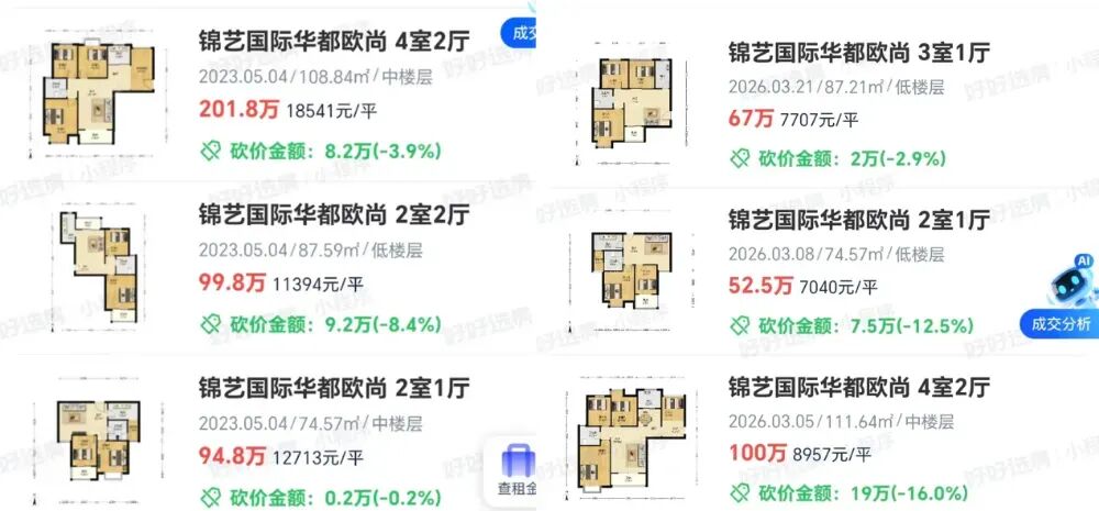 中原区的锦艺国际华都欧尚110平左右大户型和87平小户型价差,从2023年的7000元/m²,降到了现在的2000元/m²。
