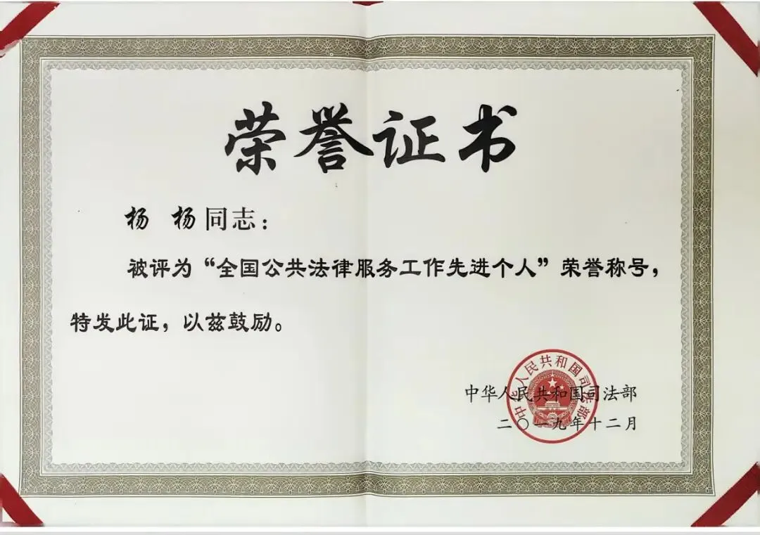 杨杨律师简要介绍:2006年8月底开始执业,14401200610481848,广东华宪润科律师事务所执业律师,自2014年10月底至今担任村居法律顾问,在服务基层、助力基层治理方面积累了一定的经验,曾获“全国公共法律服务工作先进个人”荣誉称号(国家司法部于2019年12月授予)、“全国律师行业优秀党员律师”荣誉称号(全国律师行业党委于2019年7月授予)等等。