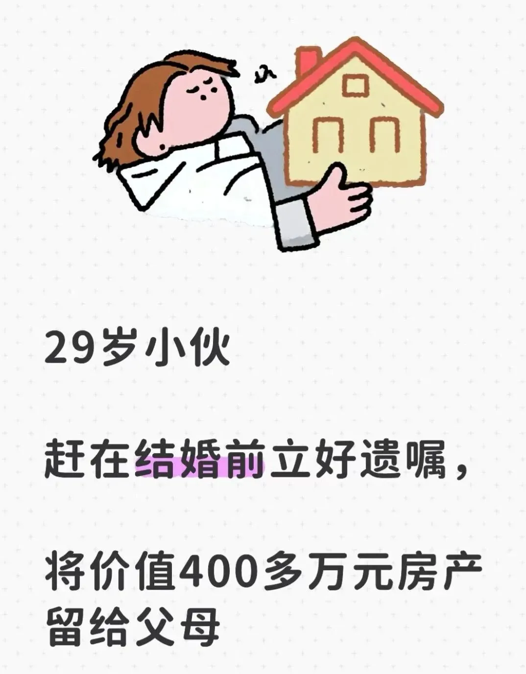 这两天有个新闻,宁波29岁小伙小李赶在今年5月婚礼前走进公证处,立下遗嘱将价值400多万元的房产全部留给父母。小李坦言:“房子是父母和祖辈掏光积蓄为我买的,如果出现意外,没有孩子的情况下,还能全部还给父母。”这则新闻登上热搜后引发热议,有网友认为“是保护婚前财产”,也有人提醒“得和女方说清楚”。但无论舆论如何分化,这起事件背后折射出的,是当代年轻人法律意识的觉醒,以及一个更深层的命题:如何为所爱之人构建周全的家庭保障体系?