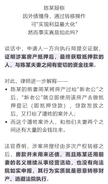 根据房产交易中心的记录证实,被执行人陈某名下位于礼泉路的房产,在短时间内经由“配偶变更”的操作,形成了多次产权转移。