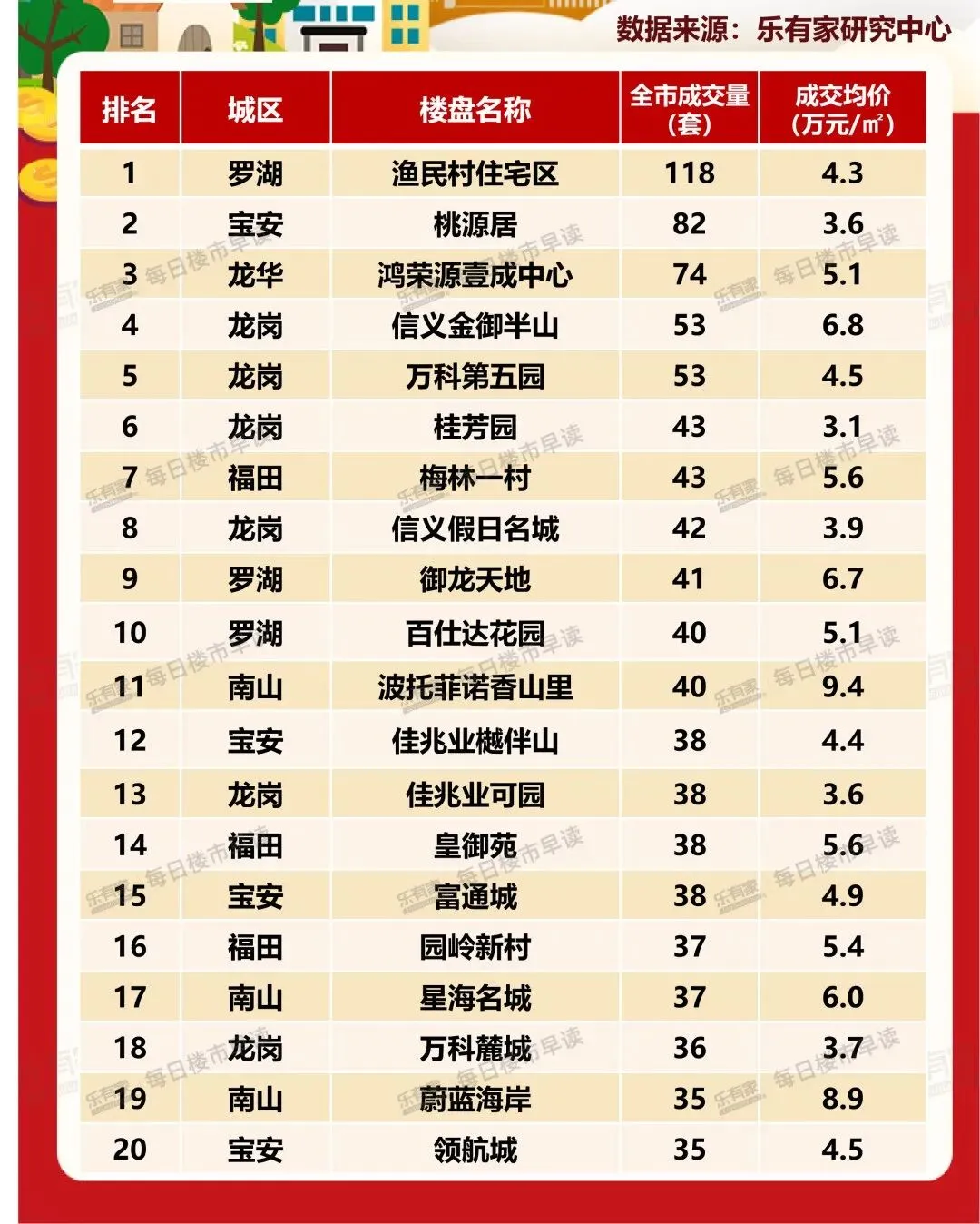 紧随其后的是宝安的桃源居(82套,均价3.6万/㎡)和龙华的鸿荣源壹成中心(74套,均价5.1万/㎡)。这三个楼盘不仅占