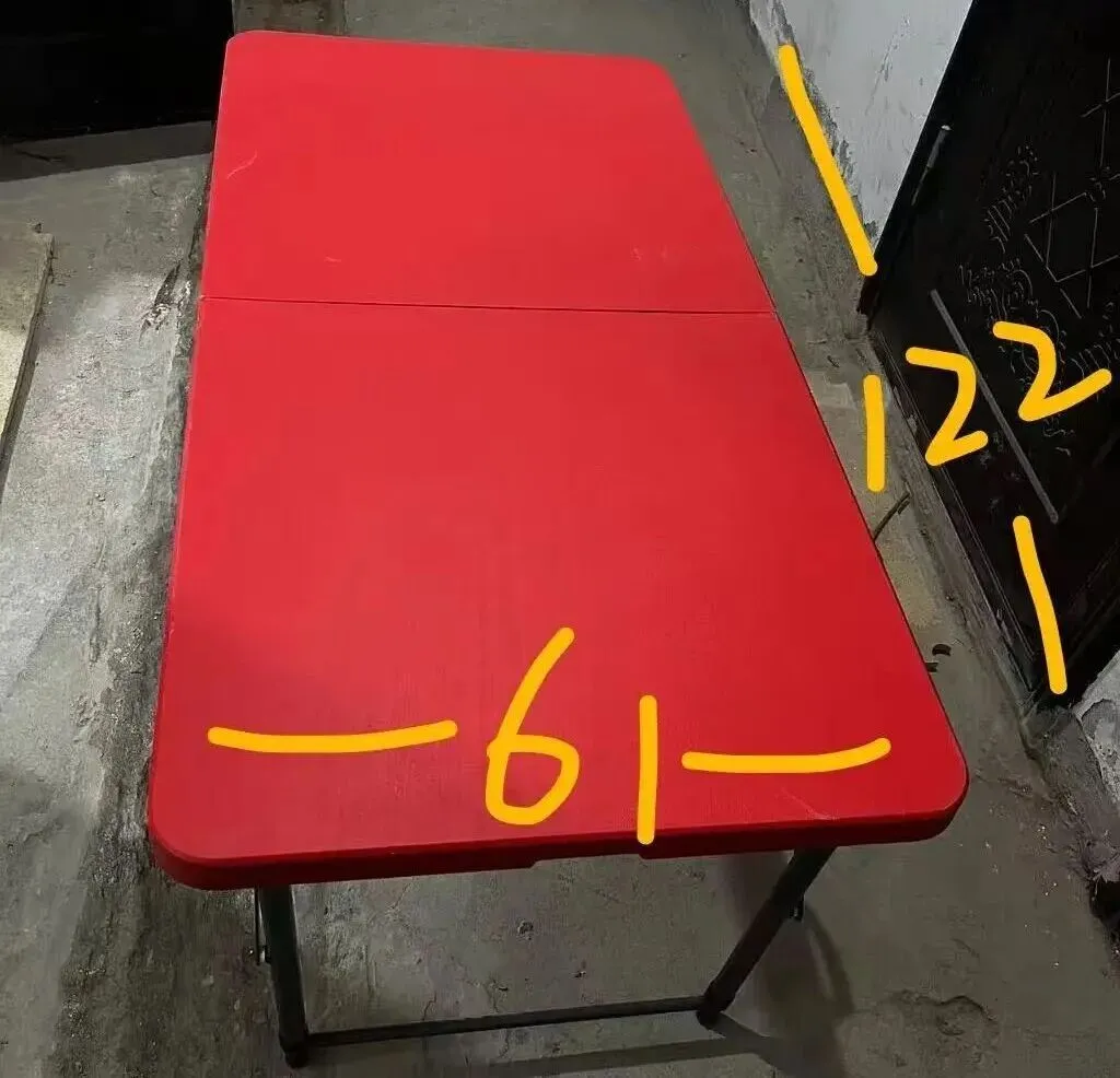出售一张红色可折叠长方形桌,尺寸122cm x 61cm,几乎全新,桌子结实,平稳,电话13934205655