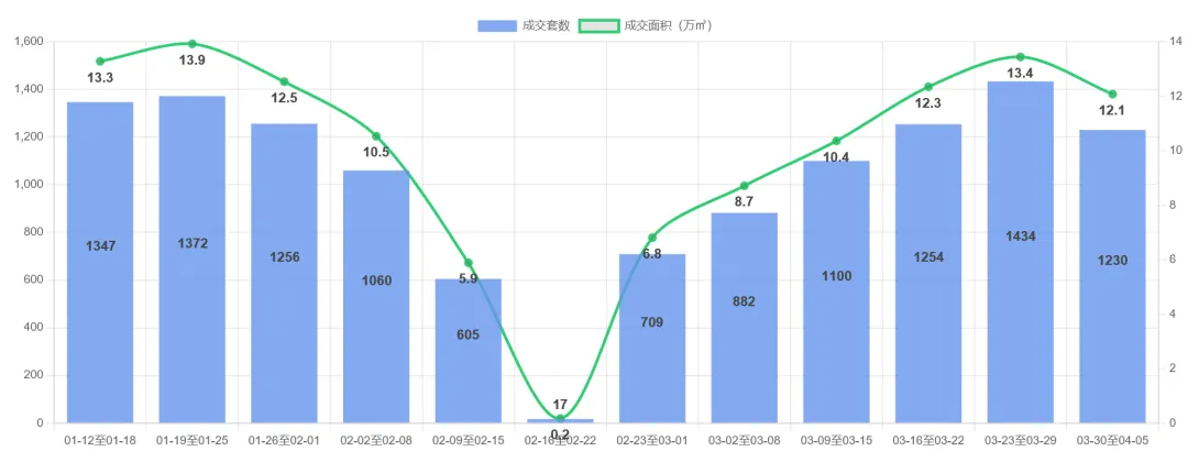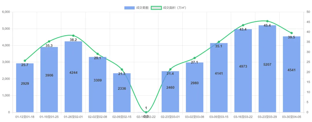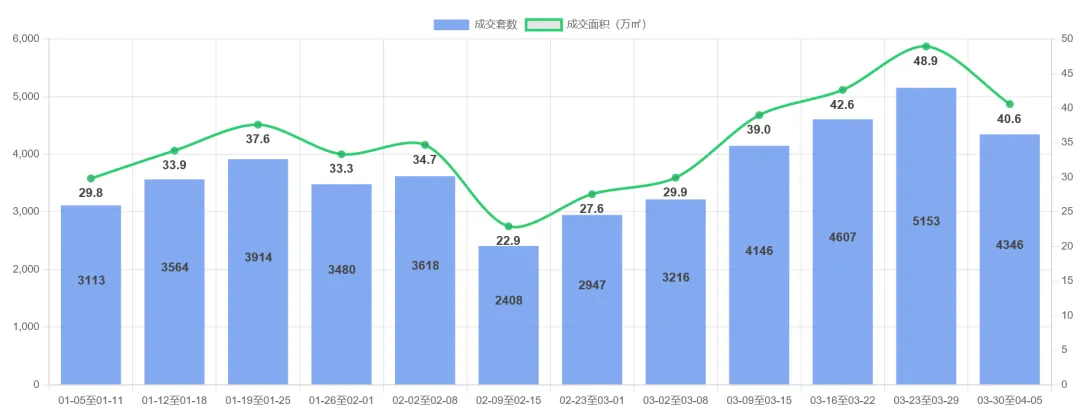成都二手房市场近期呈现明显波动。2026-03-30至04-05周度成交4,346套(405,876㎡),环比显著下滑15.7%(套数)和17.0%(面积),结束此前连续4周上涨趋势。观察6周数据(02-23至04-05),市场先经历快速回升(2,947→5,153套),但最新周出现回调。套均面积稳定在93-95㎡区间,显示主力需求保持稳定。当前市场或进入短期调整阶段,建议关注后续成交量能否企稳回升。