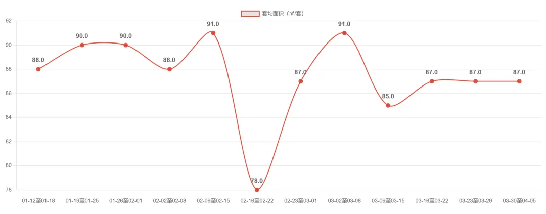 北京二手房市场近期呈现先扬后抑态势。2026年2月底以来,成交套数连续四周攀升至5,207套高点后,最新周度(3.30-4.5)回落至4,541套,环比下降12.8%,成交量仍处相对高位。套均面积稳定在87㎡左右,显示刚需户型持续主导市场。值得注意的是,近两周成交面积降幅(13.0%)略大于套数降幅,可能预示大户型成交占比微降。当前市场进入季节性调整阶段,但整体活跃度仍高于2月水平。