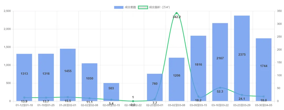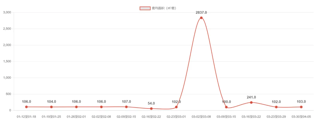 杭州二手房市场近期呈现显著波动。最新一周(3.30-4.5)成交1,744套,环比大幅下降26.6%,延续了前两周(2,375套→2,167套)的下行趋势。值得注意的是,6周内出现异常值(第二周套均面积2,837㎡,疑为数据误差),剔除后实际套均面积稳定在100-103㎡,显示刚需户型仍为主导。当前成交量已回落至春节后(2.23当周760套)的回升通道中位水平,市场进入调整期,需关注后续政策及季节性因素对成交量的影响。