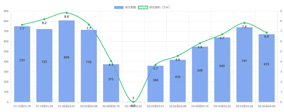 东莞二手房市场近期呈现波动回调态势。2026-03-30至04-05周成交672套(68,739.65㎡),套均面积102㎡,环比分别下降9.3%和12.3%。观察6周趋势,市场在2月底触底后持续回暖(360→741套),但最近两周出现高位回落。值得注意的是,套均面积从109㎡回落至102㎡,显示中小户型成交占比提升。当前成交量仍高于6周前水平,但需关注后续是否形成持续下行趋势。建议密切关注清明假期后的市场修复情况。