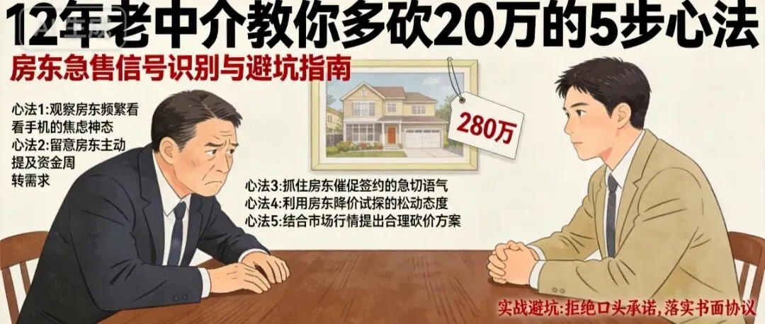 今天,我就把我12年经手上千单二手房交易总结出的谈判实战心法,掰开揉碎了讲给你听。从急售信号识别到情报搜集,从时机选择到话术模板,再到真实案例复盘——这可能是你能看到的最实操的二手房砍价指南。