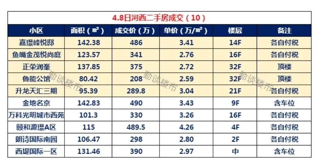 4.8日河西二手房成交共计10套,其中河西中河西南个各5套,昨天有读者留言说河西南没成交,其实鲁能公馆那天顶楼是前天成交的,当时没确定到具体房号,所以没发。正荣润峯还成交了一套顶楼,其实我之前统计了一楼和顶楼这种不好的楼层为什么3-4月成交量还不错,主要原因就是性价比,挡中间楼层业主涨价以后,这些楼层的性价比就凸显出来,所以成交增加。
