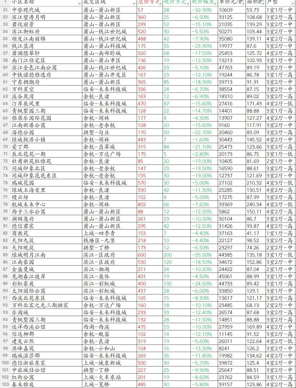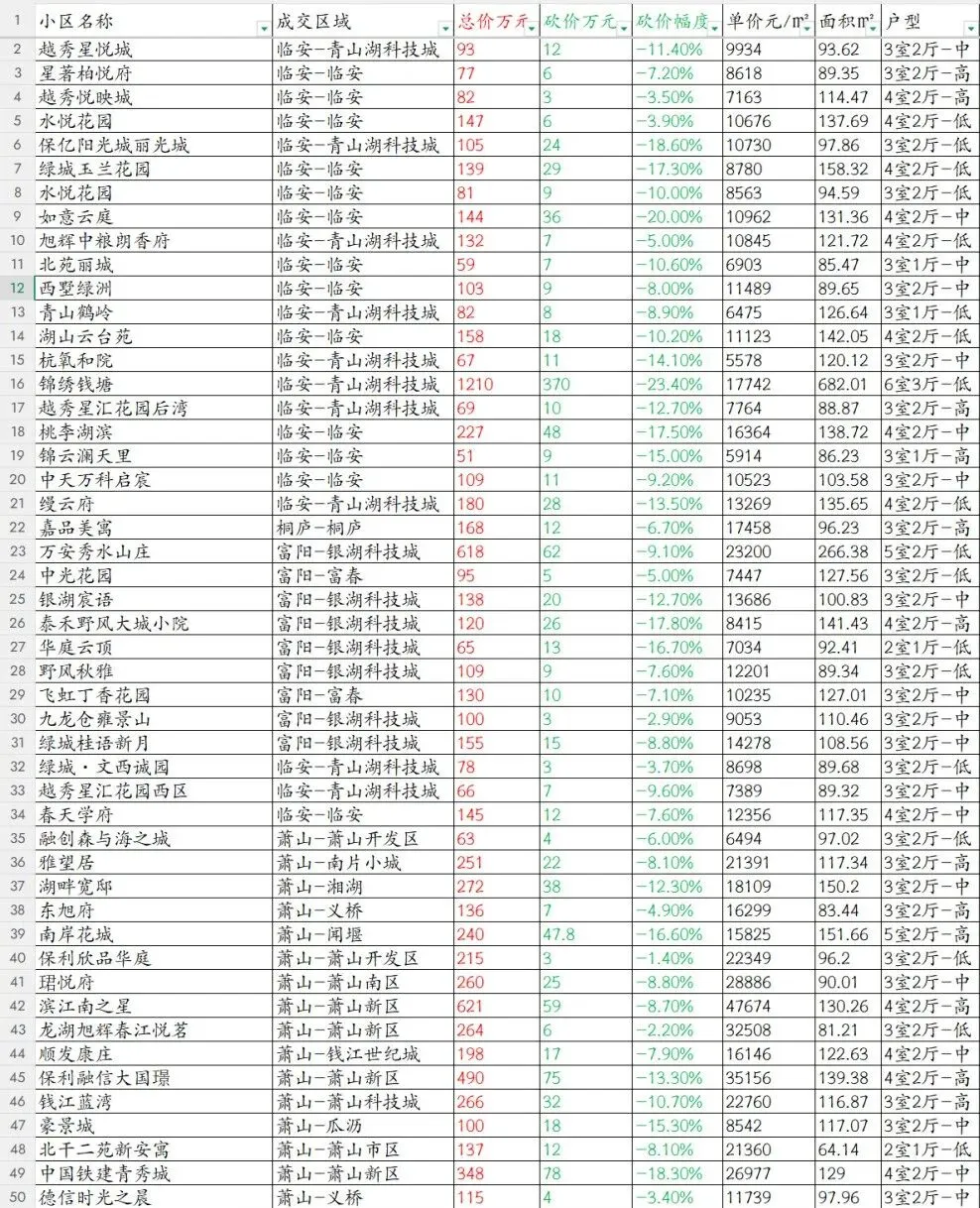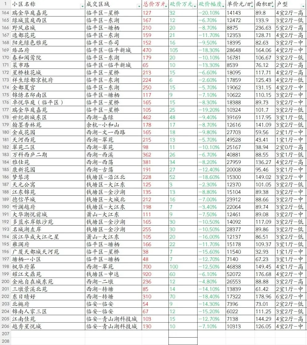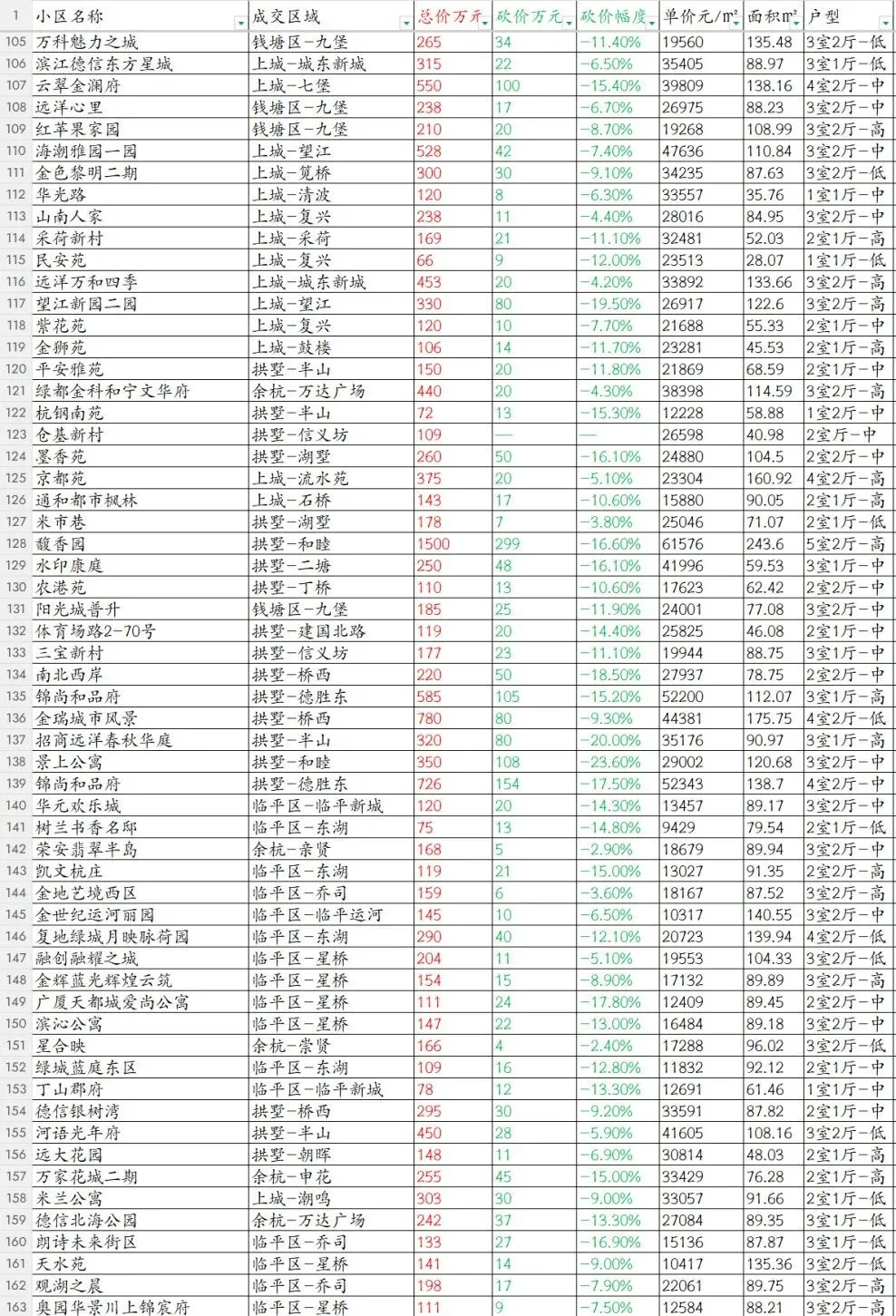从成交表现看,超8成房源出现降价,降价幅度最高达-32.90%(中誉现代城),部分刚需板块如临安、临平老城区降价幅度普遍在10%-20%,而滨江、申花等核心改善板块降价幅度相对温和,部分房源甚至出现涨价成交,凸显核心地段抗跌性。