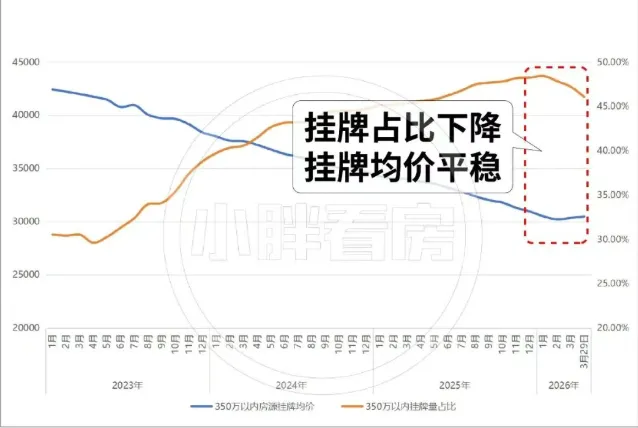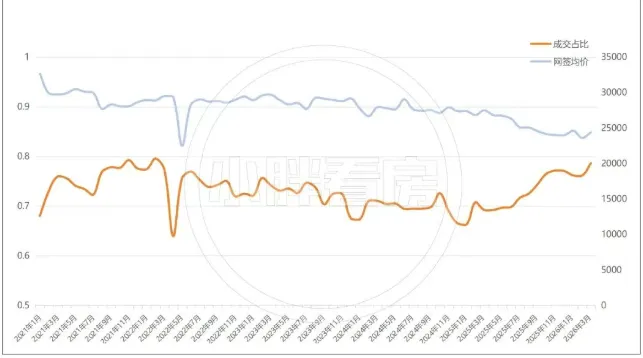 我们再将刚需房源的挂牌量占比和挂牌均价放在一起,你可以看到: