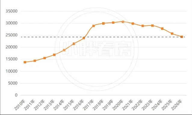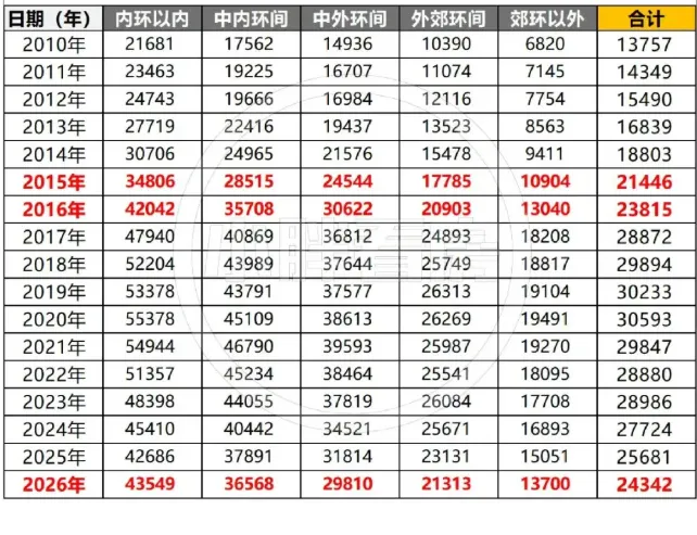 我们将2021年至今上海刚需房源的成交量占比与网签均价放在一起,可以看到,在去年7月份之前,成交占比与网签均价基本保持了同频共振而在7月份之后,成交占比开始明显上升,与此同时,网签均价的下降幅度明显放缓,换句话说,市场跌到位了,大量购买力开始进场承接!可能有朋友会好奇,目前刚需市场的价格回到了哪一年?2026年前三个月,上海总价350万以内二手房网签均价约2.43万/m²,基本回到了2016年附近,过去10年涨幅全部抹掉,回到最初的放量成交价格平台,可以说是上海房价的历史低位!不同环线的价格走势基本一致,都回到了2016年附近,再进一步下跌空间有限!